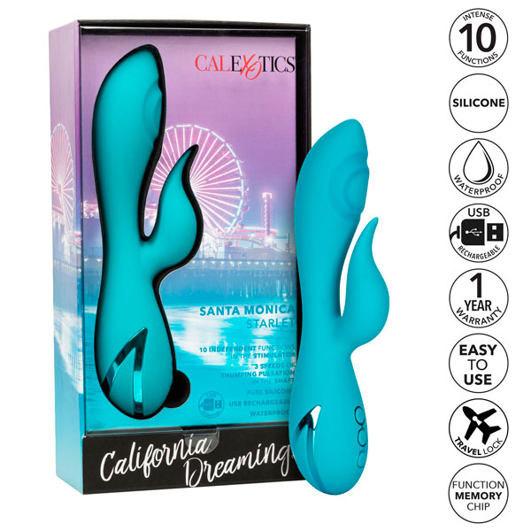 La juguetona colección California Dreaming ™ hace realidad las fantasías repletas de estrellas con la apasionada Starlet de Santa Mónica. El masajeador de diseño ergonómico está listo para esas fantasías de la Lista A con 10 funciones poderosas de vibración y 3 velocidades de pulación de golpes que te sacuden las rodillas.