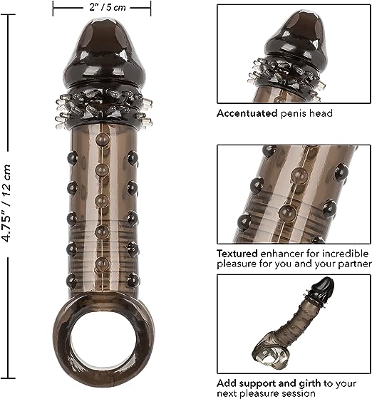 Ultimate Stud Extender disfrute de la satisfacción mutua con el potente potenciador masculino Ultimate Extender. Mientras que la succión de la manga de extremo cerrado y la cámara acanalada lo emocionan, la circunferencia adicional, la textura emocionante con tachuelas y los 16 cm de longitud dejarán a su dama temblando. La correa para el escroto incorporada y la manga gruesa brindaron soporte para una erección adicional y mayor resistencia para prolongar e intensificar el placer de cualquier pareja. Aumente su placer y nunca se conforme con menos cuando se trata de tamaño, este extensor súper elástico con correa de soporte para el escroto hará que usted y su amante anhelen más, más, más. Nuestro potenciador súper elástico se estira para adaptarse a cualquier tamaño de hombres. El TPE suave y elástico no contiene fragancias, ftalatos ni mantenimiento para mantener los puntos más sensibles felices y saludables. Disfrute de una fácil limpieza con esta funda estimuladora que no requiere mantenimiento, simplemente lávela con agua tibia y jabón antes y después de cada uso. Utilice abundante lubricante para una fácil inserción. Características: impermeable material: tpe medidas: 16 x 4,5 cm