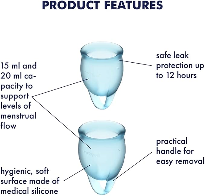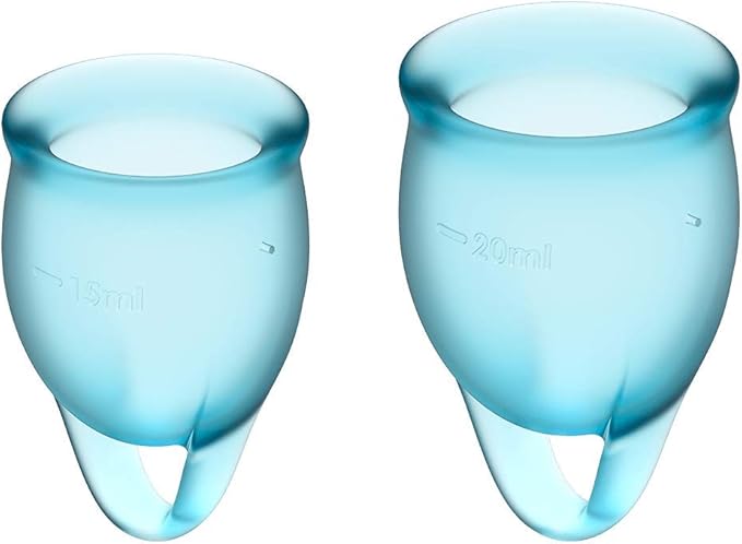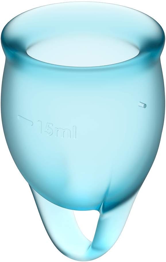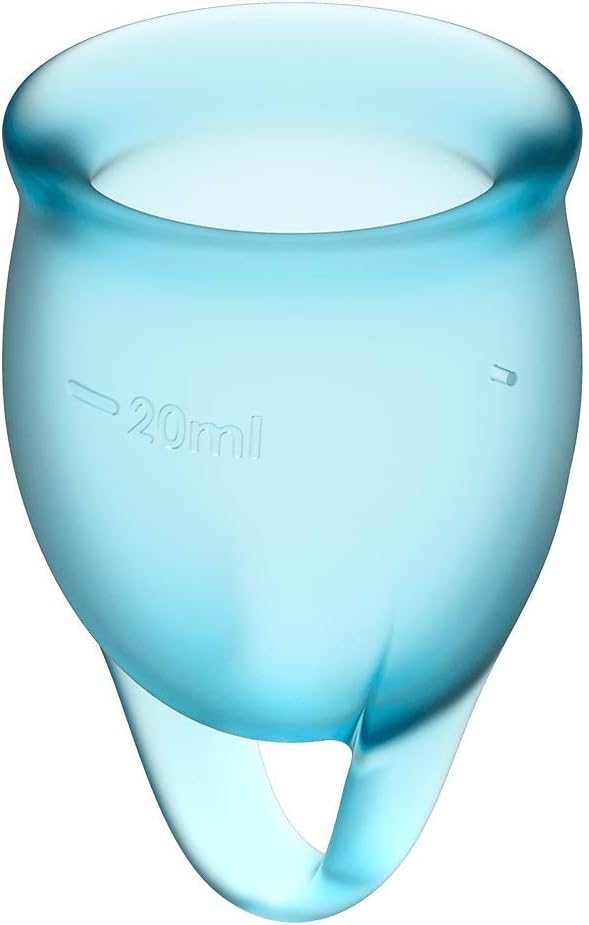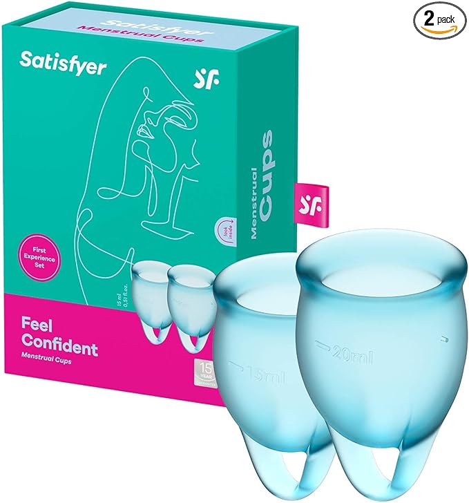 Satisfyer Taza menstrual Feel Confident – Vaso de período reutilizable con anillo de extracción – Silicona suave y flexible segura para el cuerpo, fácil inserción y extracción – Incluye 2 tamaños